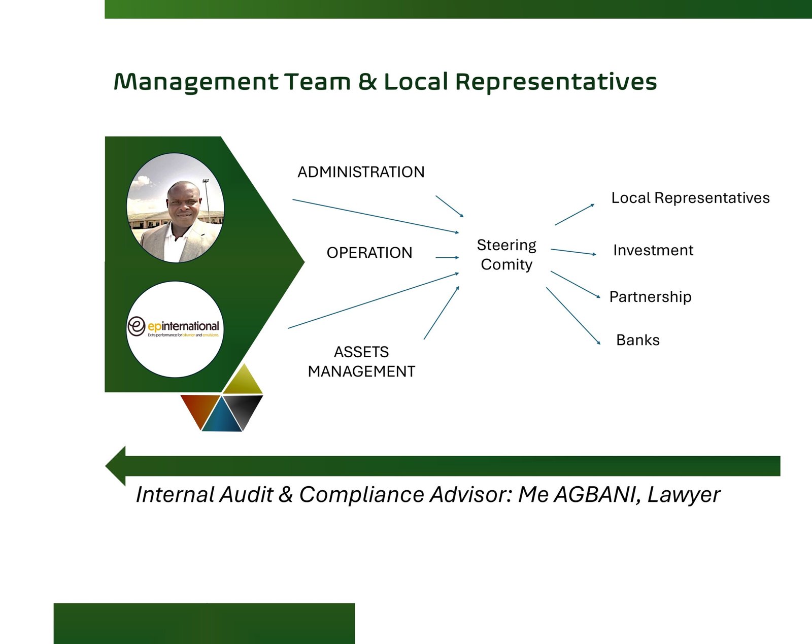 At the top, the Management Team is shown, with Boris GBAGUIDI as the General Manager, in association with EP INTERNATIONAL. Below, the Local Representatives are listed, each assigned to specific regions or departments. Their main role is to bridge communication between the Management Team and local operations, ensuring that company policies are effectively implemented. The diagram demonstrates how collaboration between Boris GBAGUIDI, EP INTERNATIONAL, and the local representatives supports the company’s goals and helps address regional needs efficiently, while Internal audit and compliance are verified by Maître AGBANI.