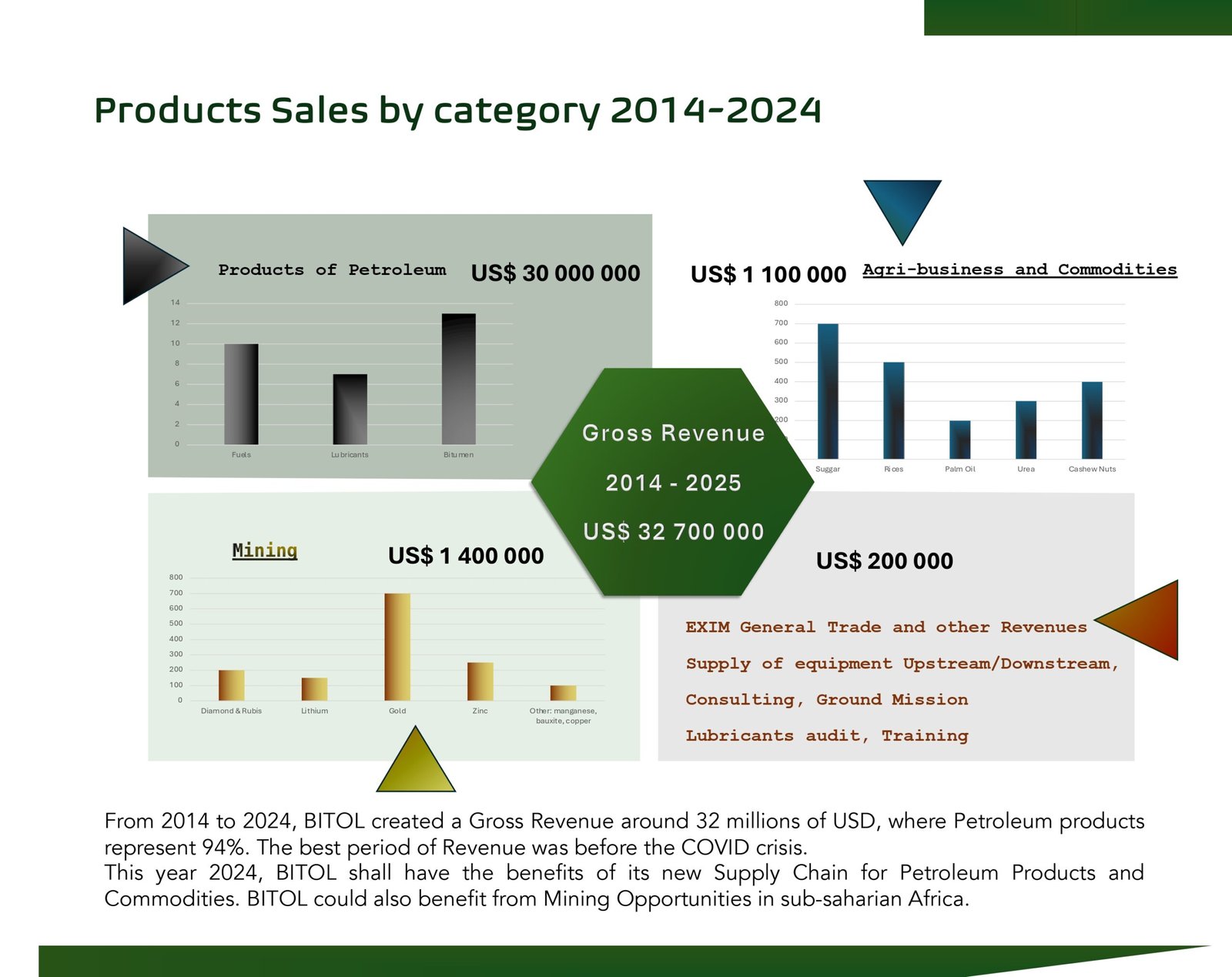 The next diagram is titled “Products Sales by category 2014–2024,” but there is an error in the title: the chart actually represents sales up to and including the year 2025. The diagram shows the breakdown of total revenue by product category. Petroleum products generated the highest sales, reaching 30,000,000 USD. Agri-business and commodities contributed 1,100,000 USD, while Mining accounted for 1,400,000 USD. The EXIM category had sales of 200,000 USD. The total revenue for the period 2014–2025 is 32,700,000 USD. This chart highlights the dominant role of petroleum products in the company’s sales, as well as the contributions from other sectors such as agri-business, mining, and EXIM.