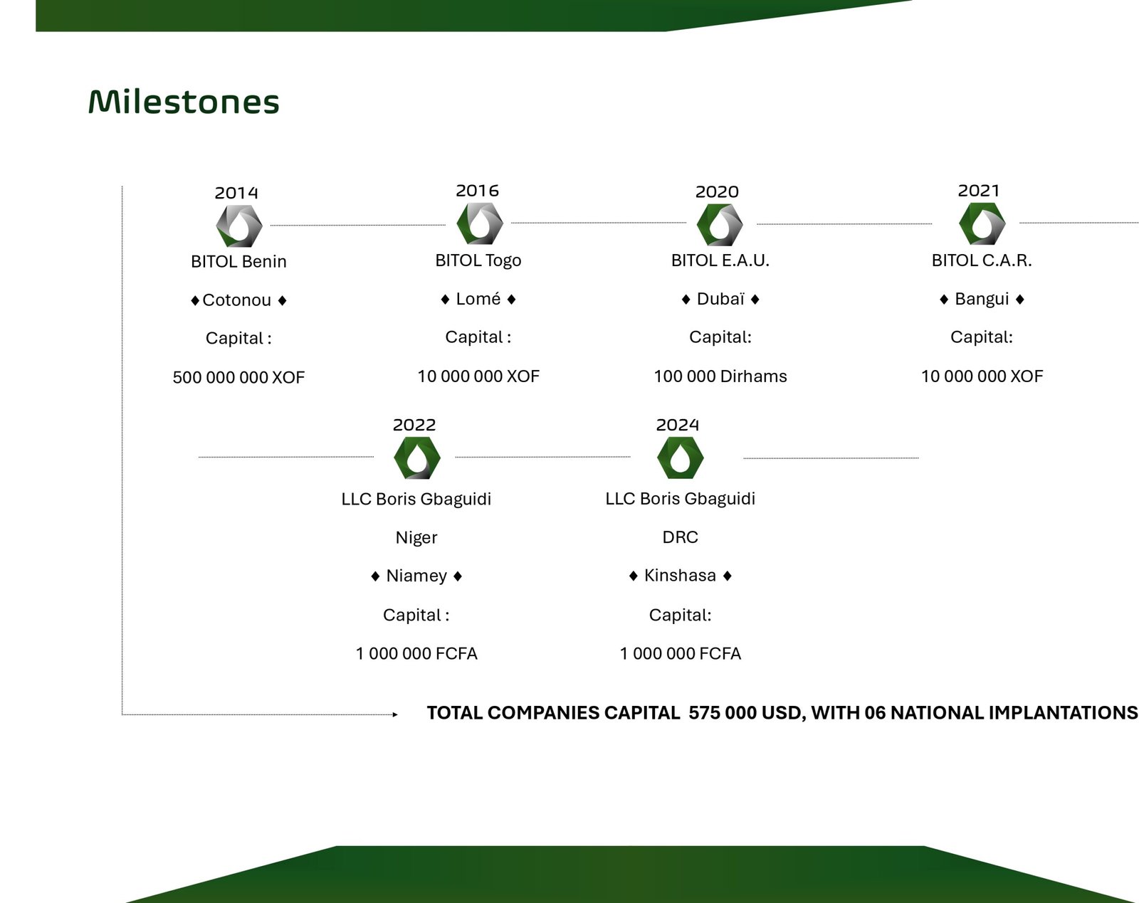 The following diagram highlights the key milestones achieved by Bitol since 2014.