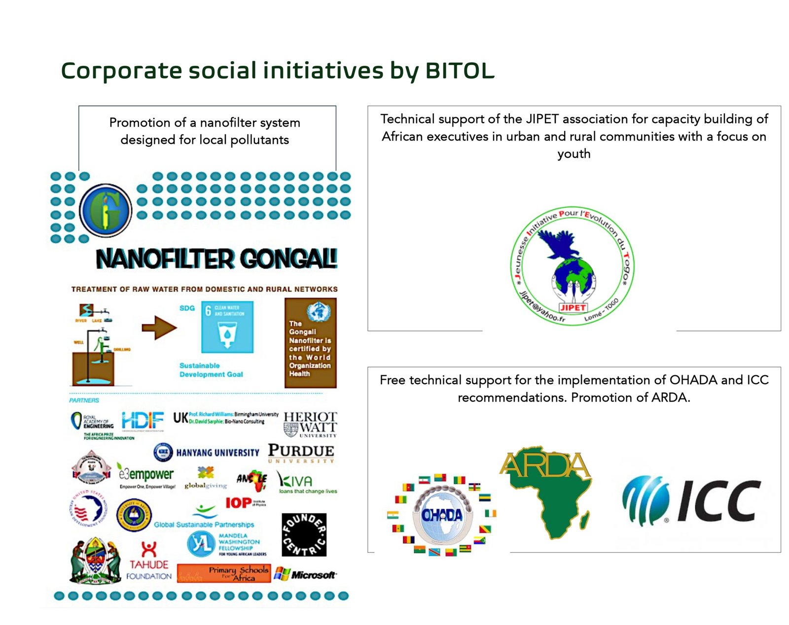 The information that follow are property of our company (design and documentation) and reflect our vision, values, and activities. BITOL is led by Boris Gbaguidi, a trained senior engineer, committed to promote innovation and sustainability while building strong partnerships and delivering high-quality solutions.